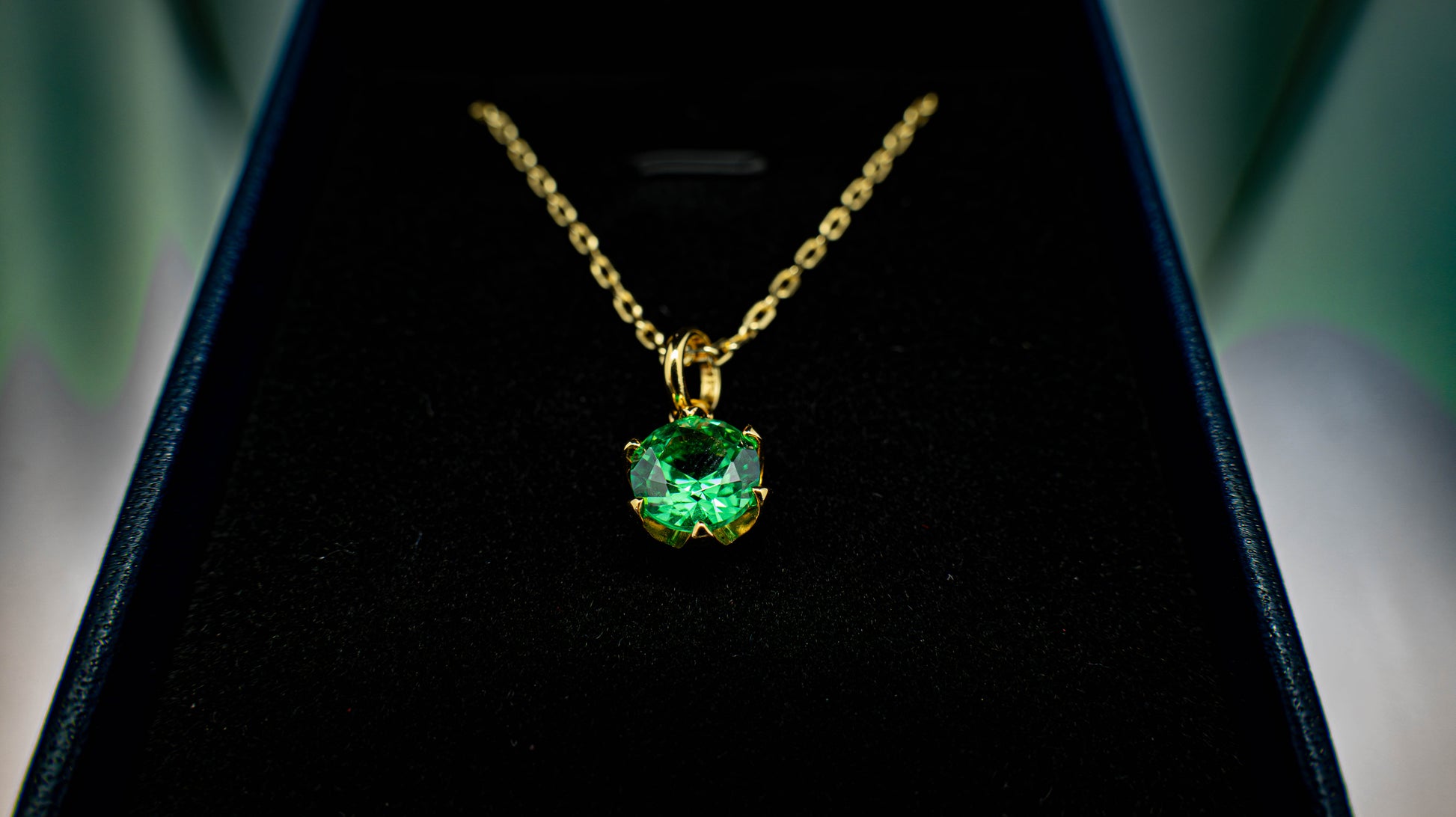 This Emerald Cutting Laboratory Gemstone Necklace showcases a precisely cut emerald that highlights the stone’s natural brilliance and vivid green hue. Expertly crafted to laboratory standards, the gemstone combines technical precision with elegant design, offering a distinctive piece that pairs scientific excellence with timeless style.